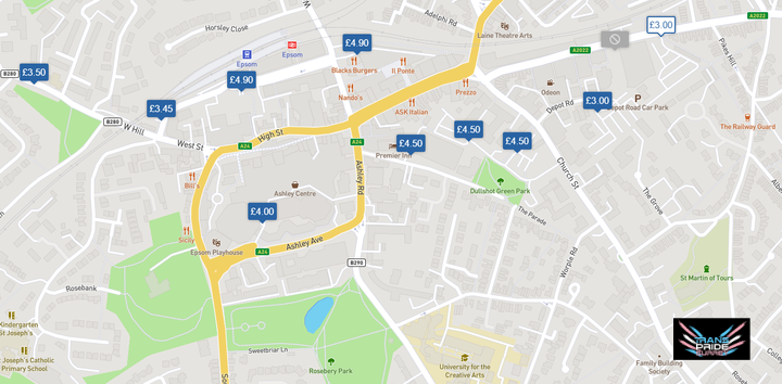 Epsom station is a direct line from London Waterloo, London Victoria & London Bridge, lots of buses and parking.